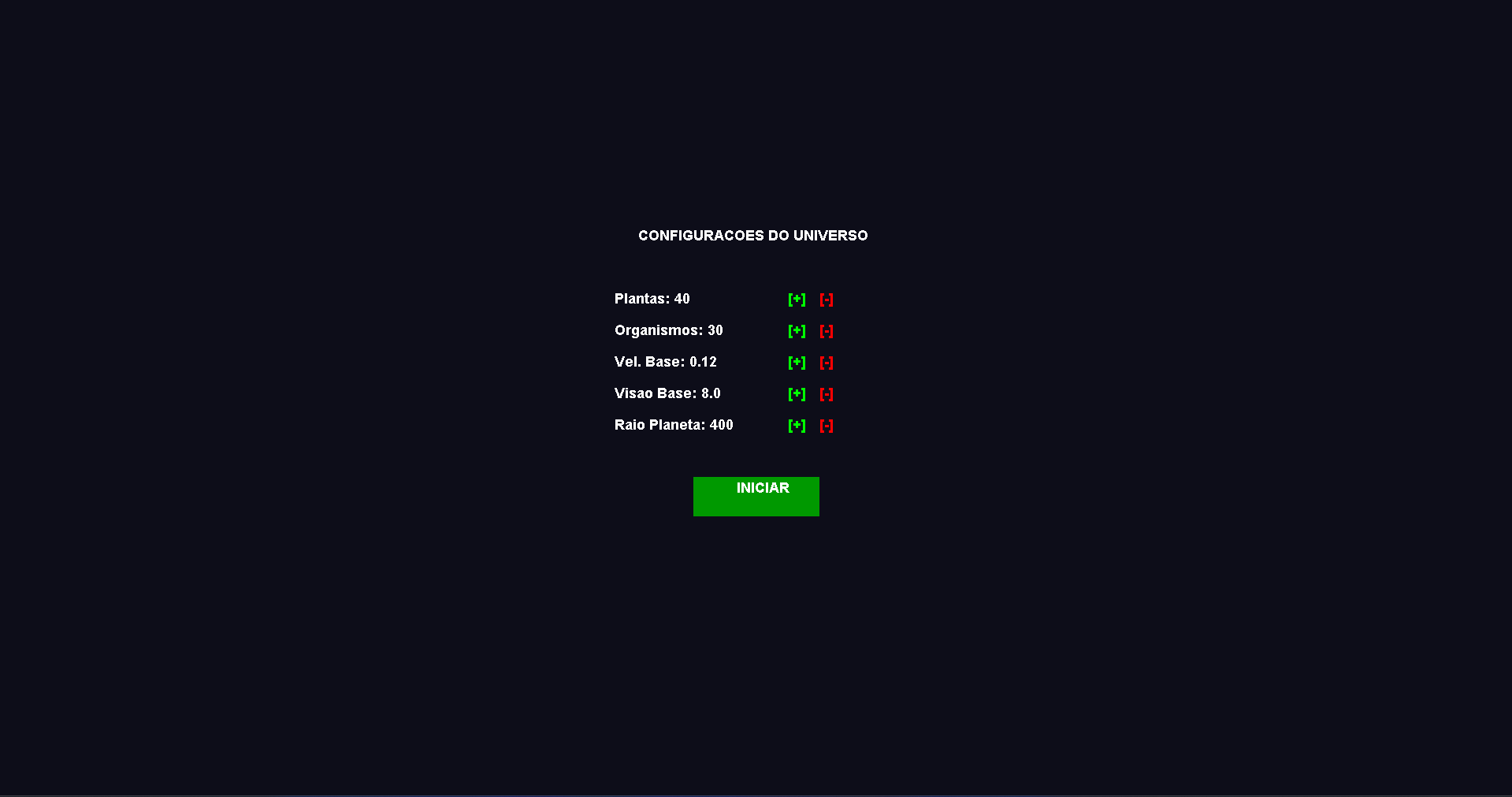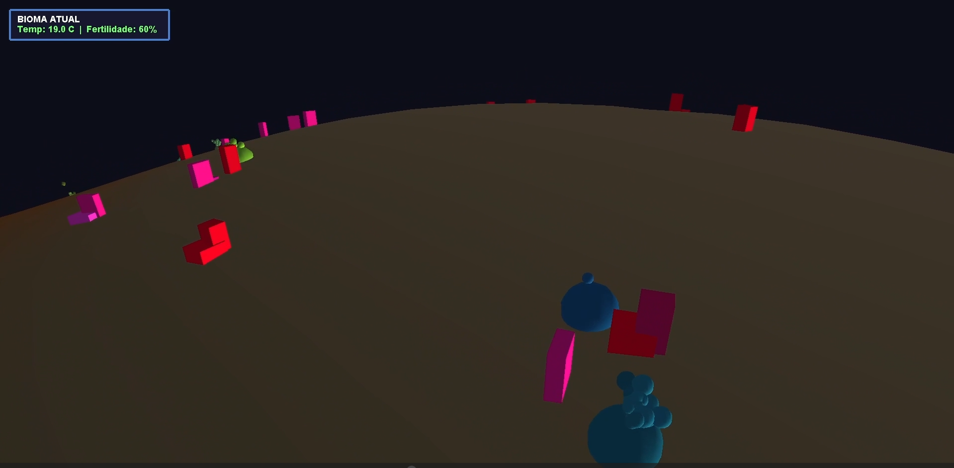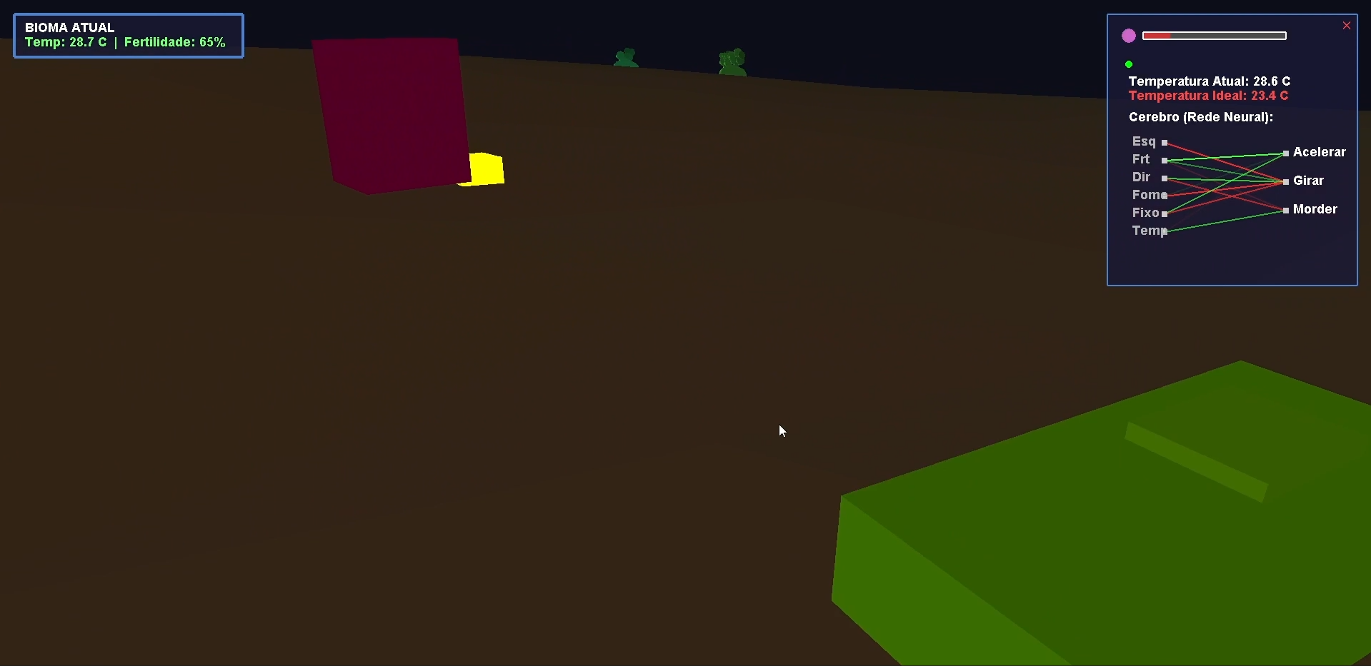 - ⚙️ Ação e Reação: Comportamentos não são escritos no código, eles emergem naturalmente das necessidades de cada criatura.